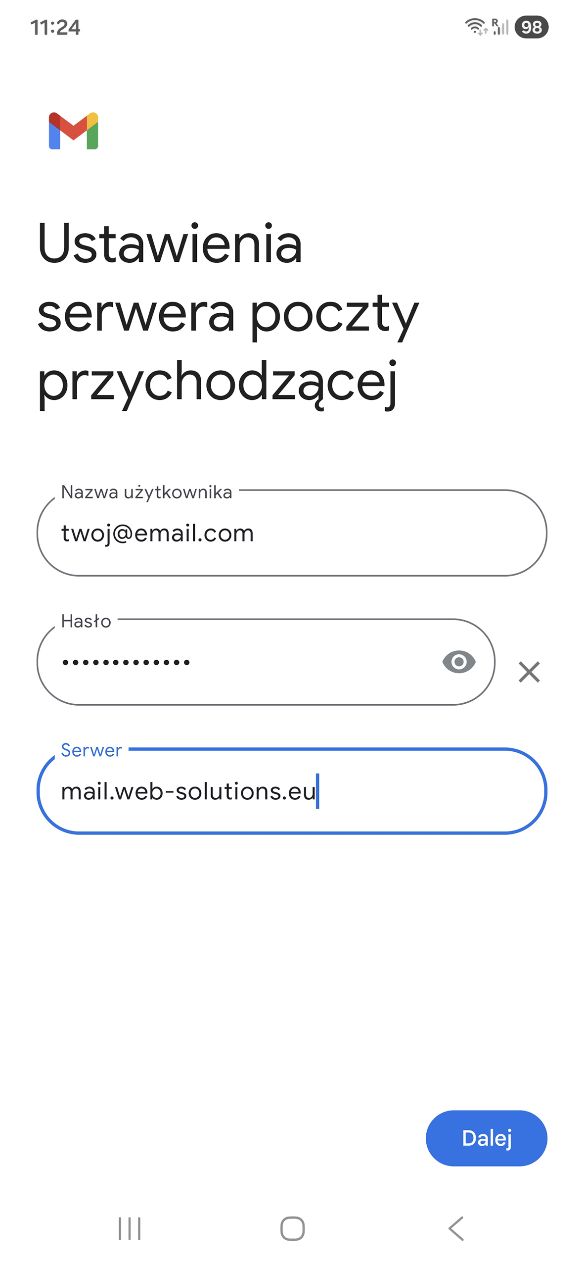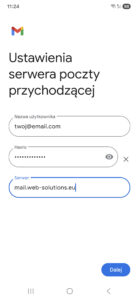 8. Zmień serwer poczty przychodzącej na mail.web-solutions.eu i kliknij Dalej.