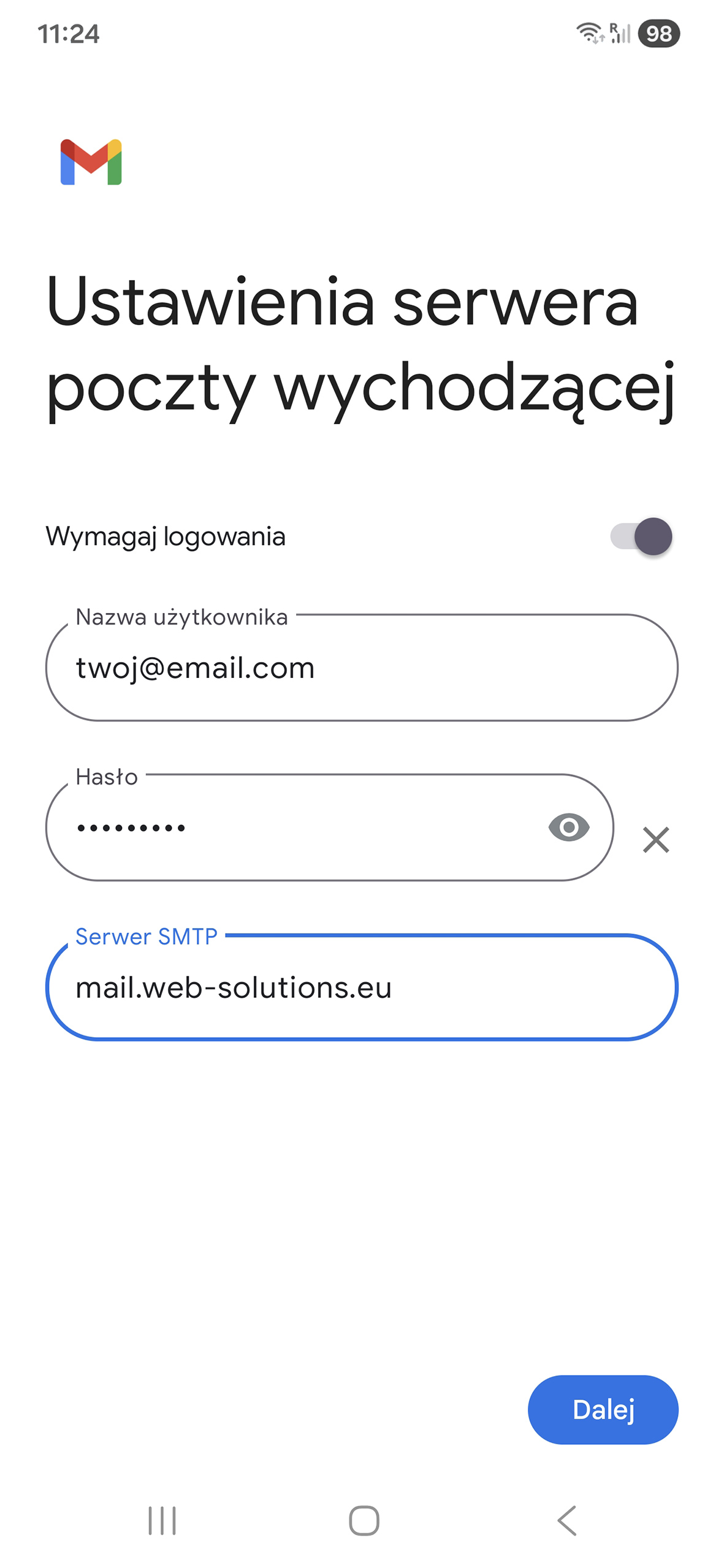 9. Zmień serwer poczty wychodzącej na mail.web-solutions.eu i kliknij Dalej.