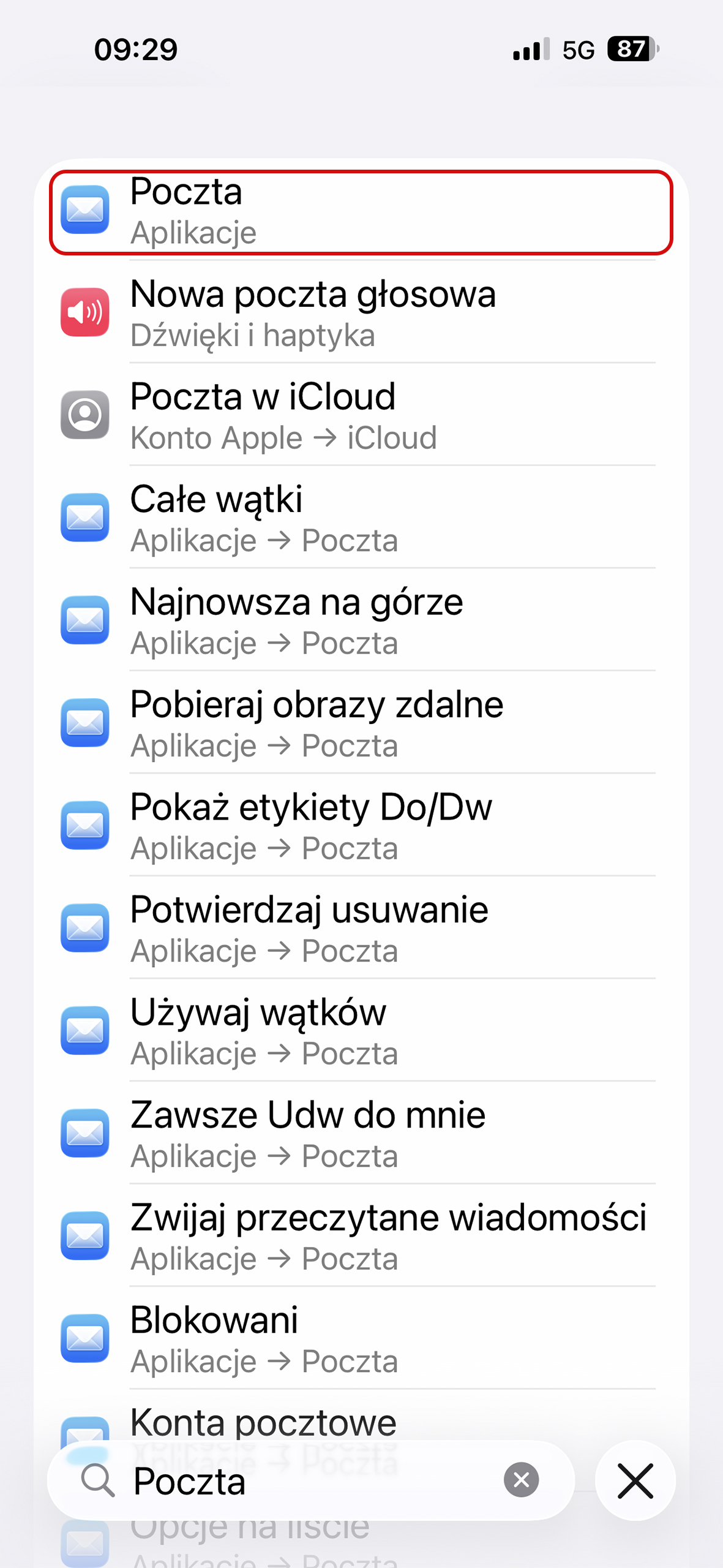 2. Wyszukaj w ustawieniach aplikację “Poczta”.