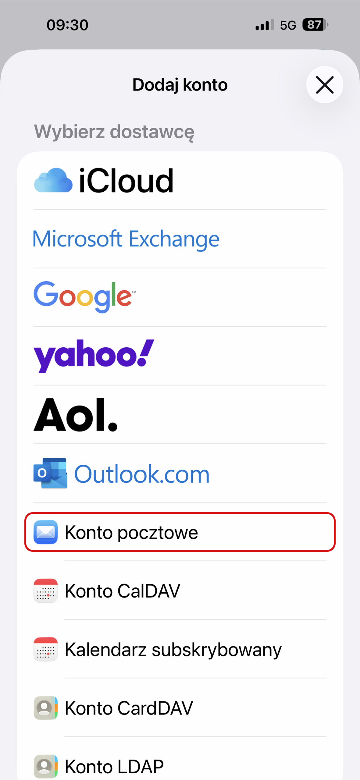 6. Wybierz “Konto pocztowe”.