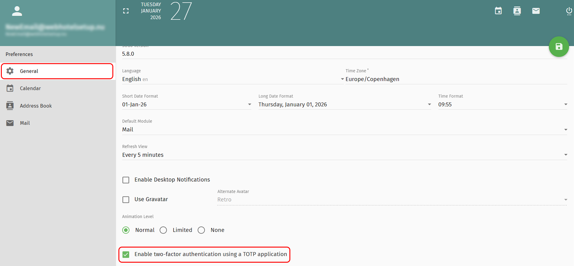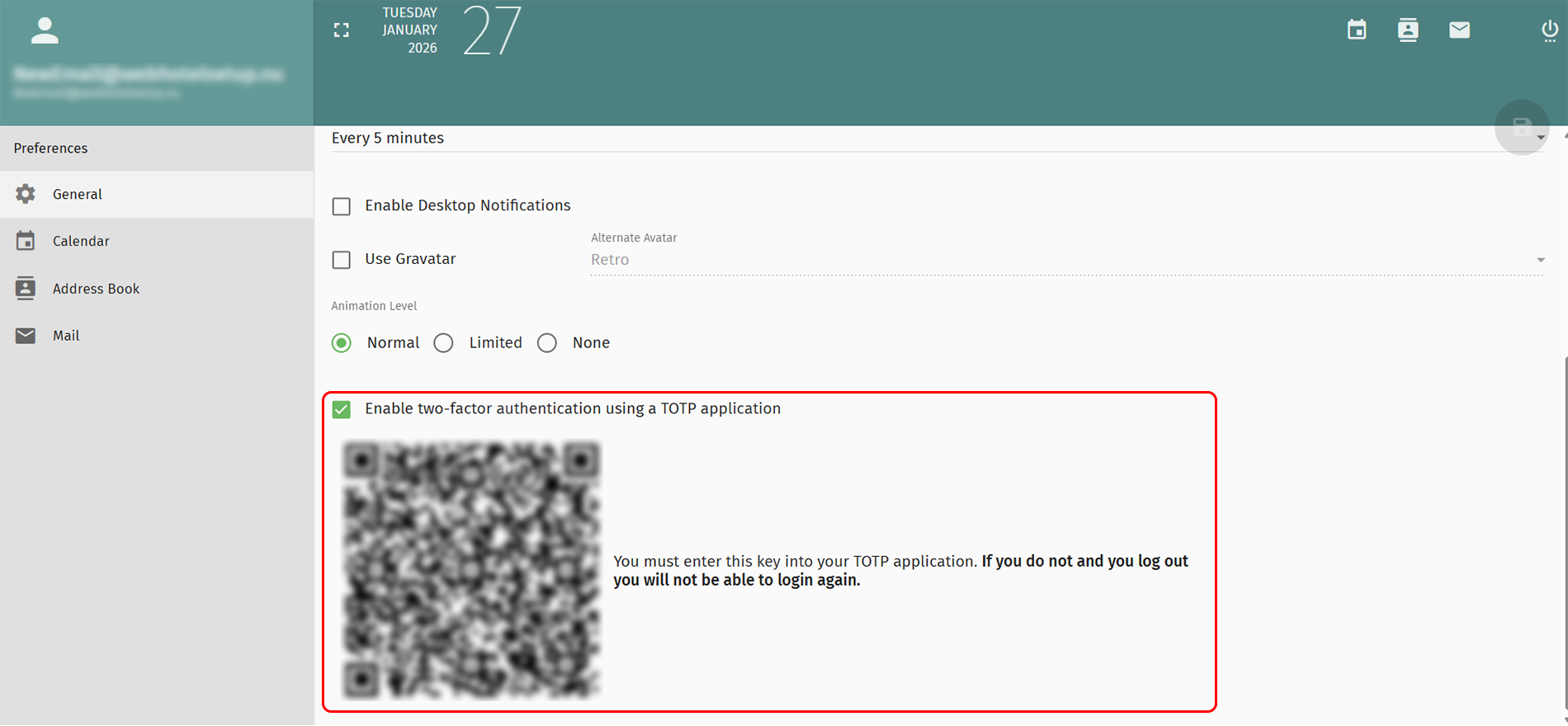 Ustawienia konta Webmail - Skonfiguruj uwierzytelnianie dwuskładnikowe (2FA) w poczcie internetowej SOGo.